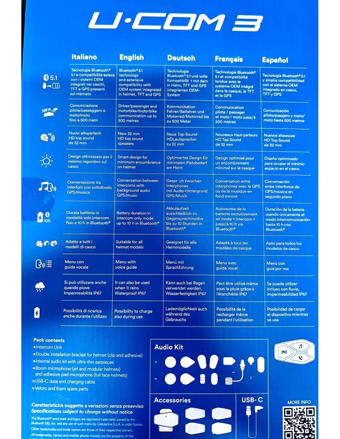 U-COM 3 è dotato di interfono HD, con una maggiore nitidezza dell'audio rispetto agli interfoni a 2 vie in circolazione. Il controllo avanzato del rumore aiuta anche a filtrare i suoni della strada in modo che la vostra voce rimanga chiara e pulita attraverso l'interfono. E' dotato di altoparlanti HD da 32mm con elevata qualità dei bassi, per ascoltare la tua musica preferita anche in sottofondo durante una conversazione.