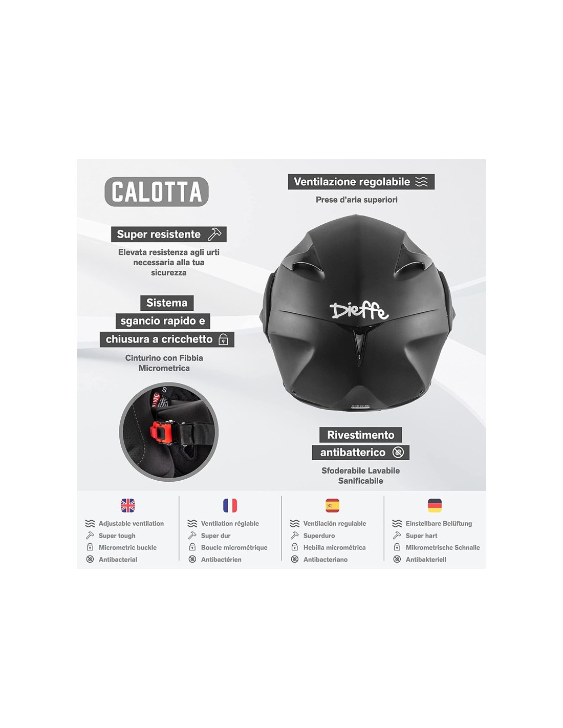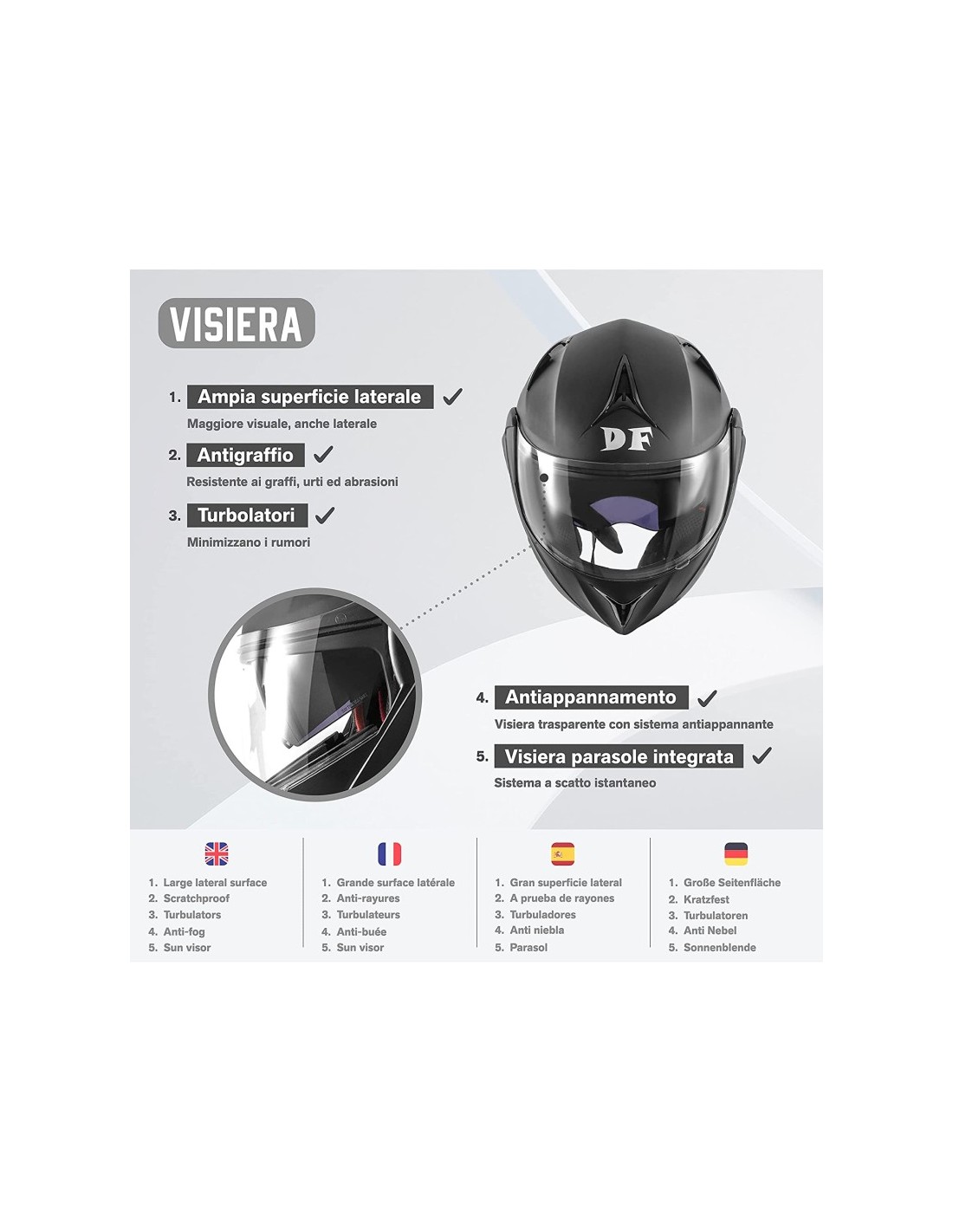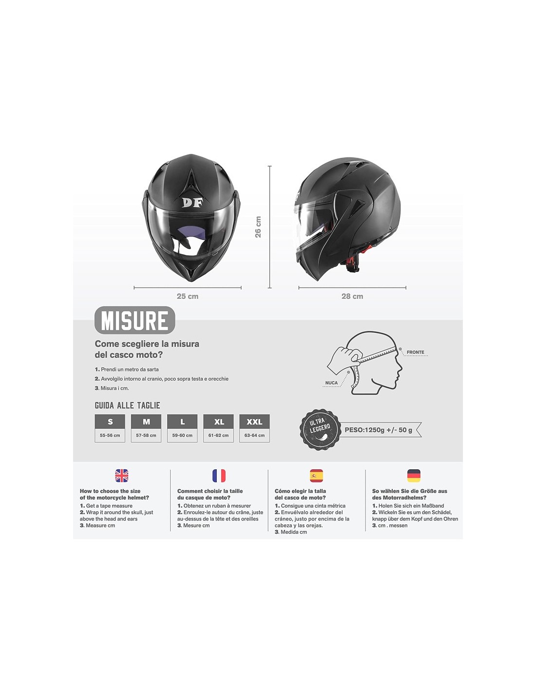 Modulare Dieffe con doppia visiera, design accattivante e prezzo competitivo. Pensato per chi vuole godere della versatilità dei caschi apribili senza rinunciare ad un look sportivo. Il sistema esclusivo di doppia visiera permette ai motociclisti di guidare sempre con la giusta luce e con la massima sicurezza Dotato di meccanismo per movimentare la visiera parasole Mentoniera apribile tramite pulsante centrale ergonomico Interno completamente sfoderabile e lavabile Calotta esterna in resina termoplastica Interno ad alta densita’ per il massimo assorbimento degli urti Ampi canalizzatori d’aria per ventilazione Visiera: visiera trasparente antigraffio e visiera parasole antigraffio a scomparsa Chiusura micrometrica Taglia/Circ. cranica (cm) S/55-56cm M/57-58cm L/59-60cm XL/61cm XXL/63-64cm